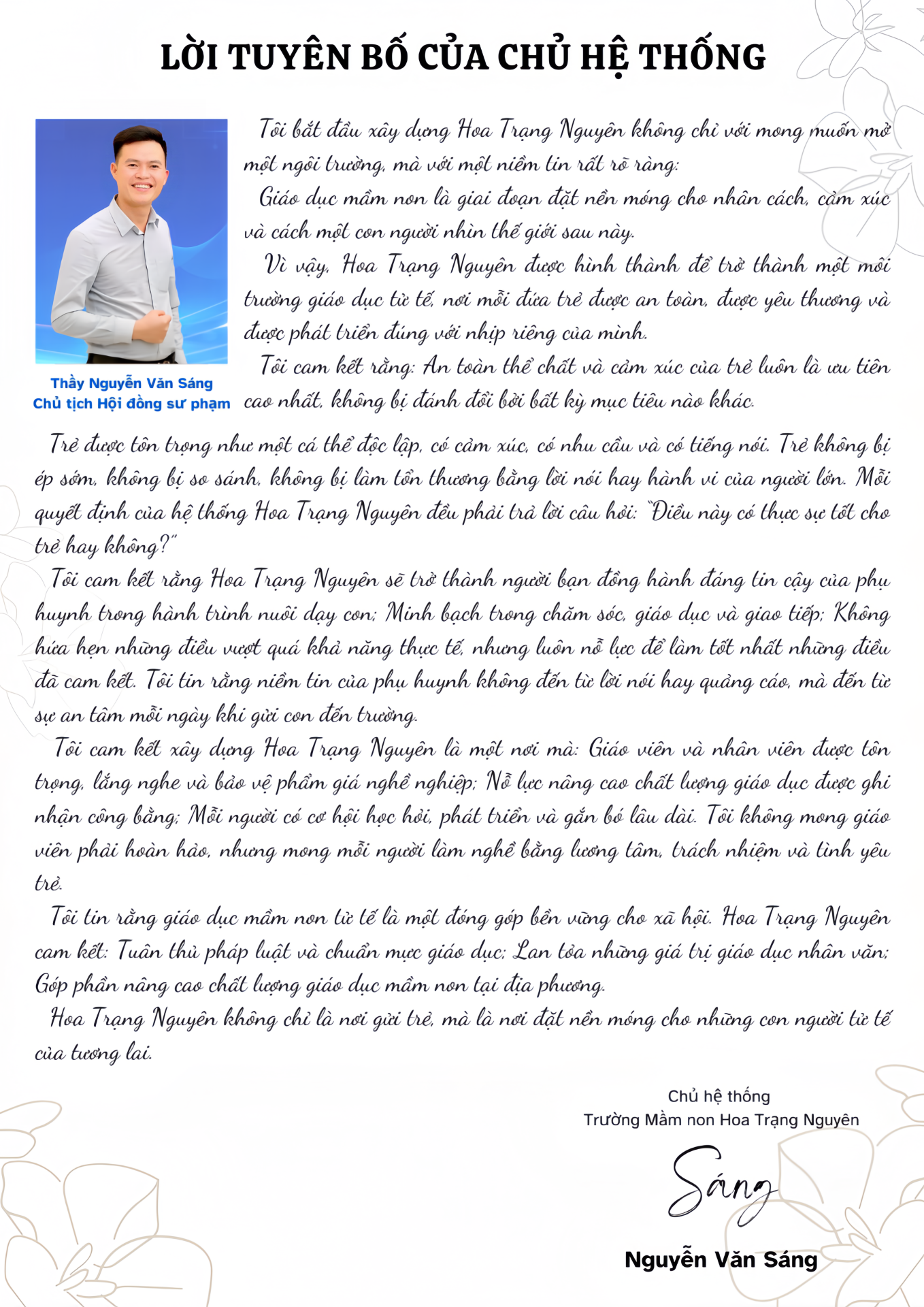 Lời tuyên bố của Chủ hệ thống Trường mầm non Hoa Trạng Nguyên16:10 - 13/01/2026Giới thiệu, Đội ngũ giáo viên, Chia sẻ:
