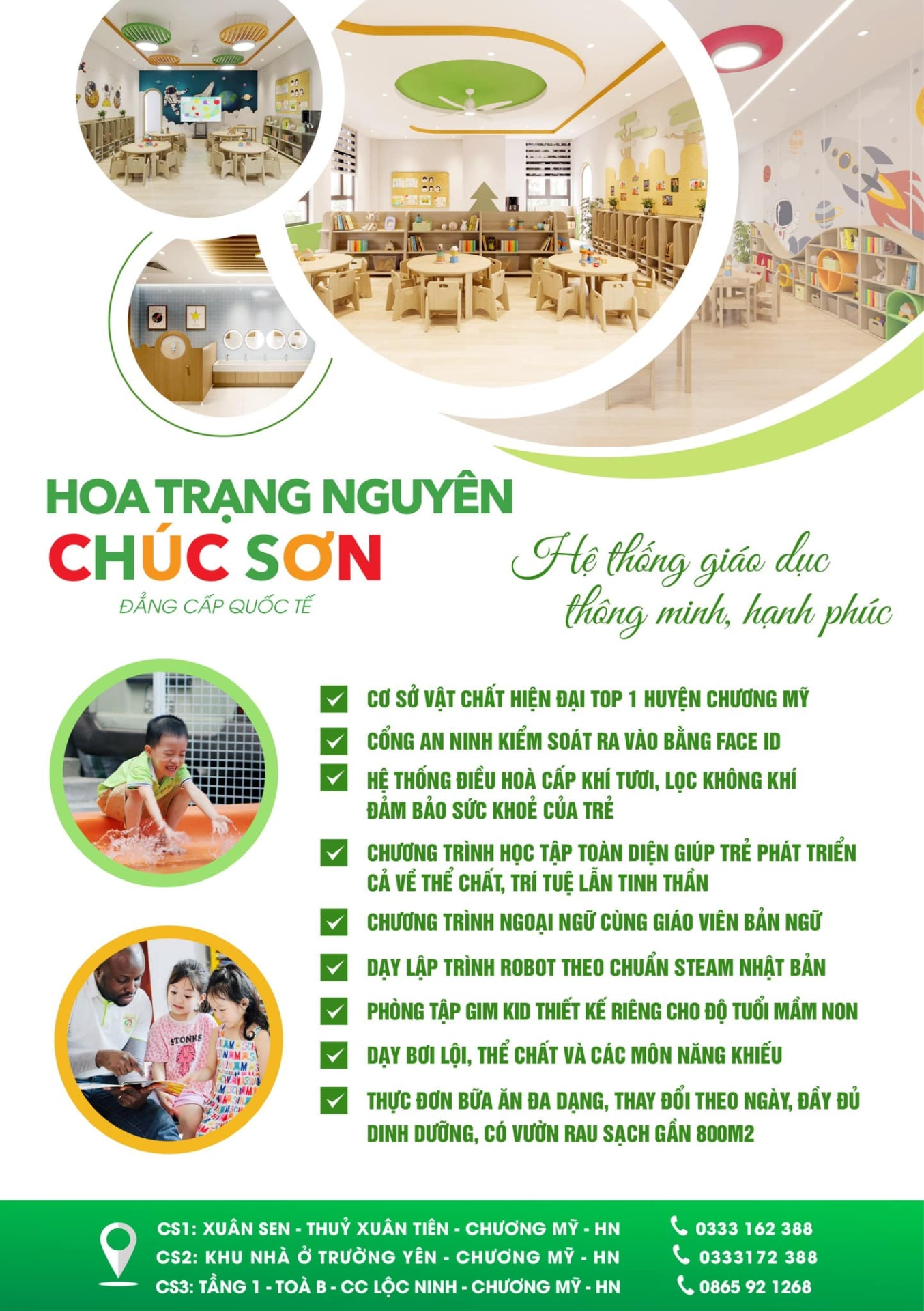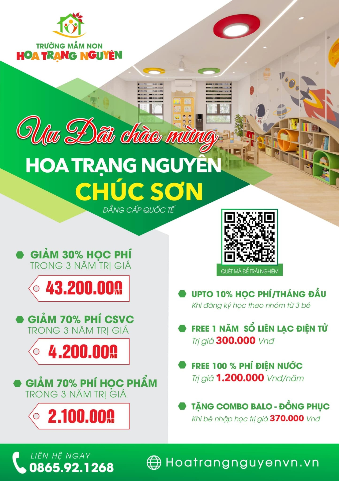 “Chớp ngay cơ hội” và đăng ký cho bé học tập tại Hoa Trạng Nguyên Chúc Sơn để nhận được những ưu đãi vô cùng hấp dẫn lên đến 50 triệu đồng ba mẹ nhé! Thời gian áp dụng khi ba mẹ đăng ký từ nay đến 30/9/2024!!!